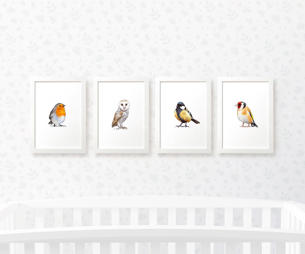 This gorgeous bird nursery set of 4 prints is the perfect gift for expecting parents or to welcome a new baby. Your set of prints will include a robin, barn owl, great tit and gold finch. Ideal as a first birthday gift or gender-neutral baby shower gift, these prints will complete your bird-themed baby room