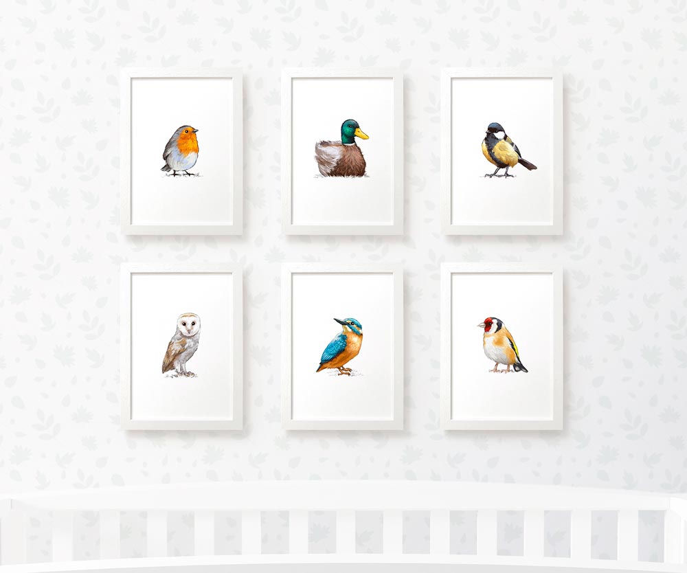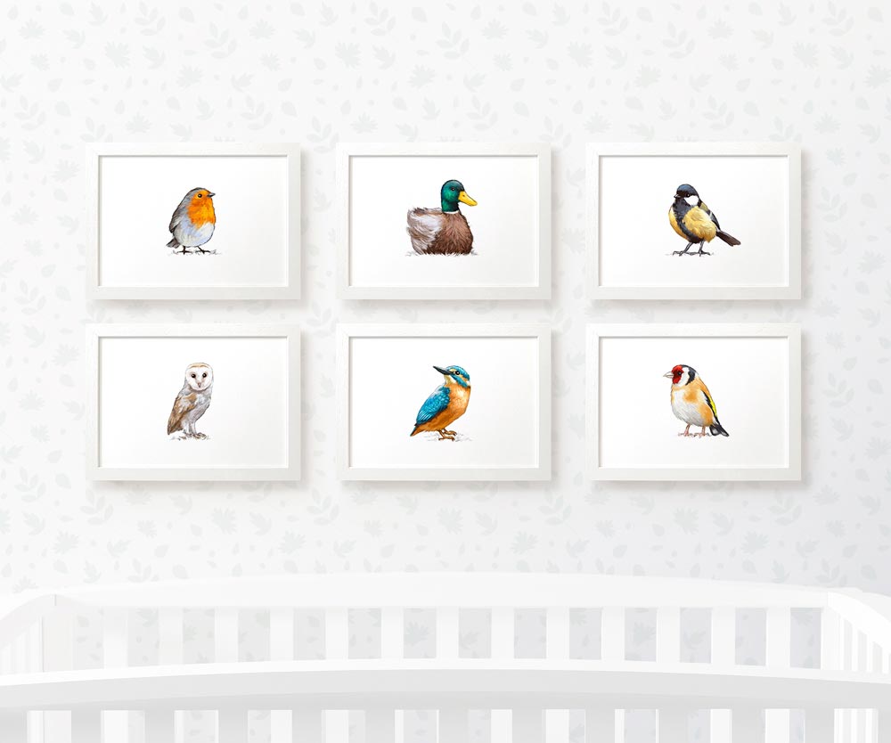 This gorgeous bird nursery set of 6 prints is the perfect gift for expecting parents or to welcome a new baby. Your set of prints will include a robin, barn owl, mallard duck, kingfisher, great tit and goldfinch. Ideal as a first birthday gift or gender-neutral baby shower gift, these prints will complete your bird-themed baby room.
