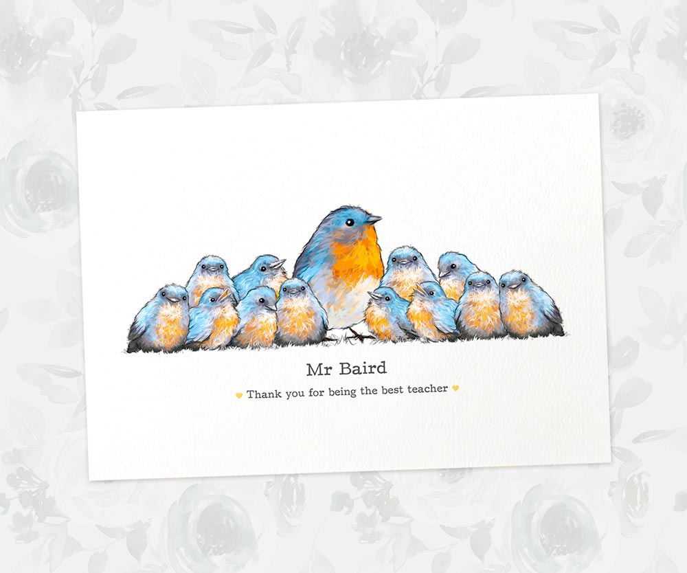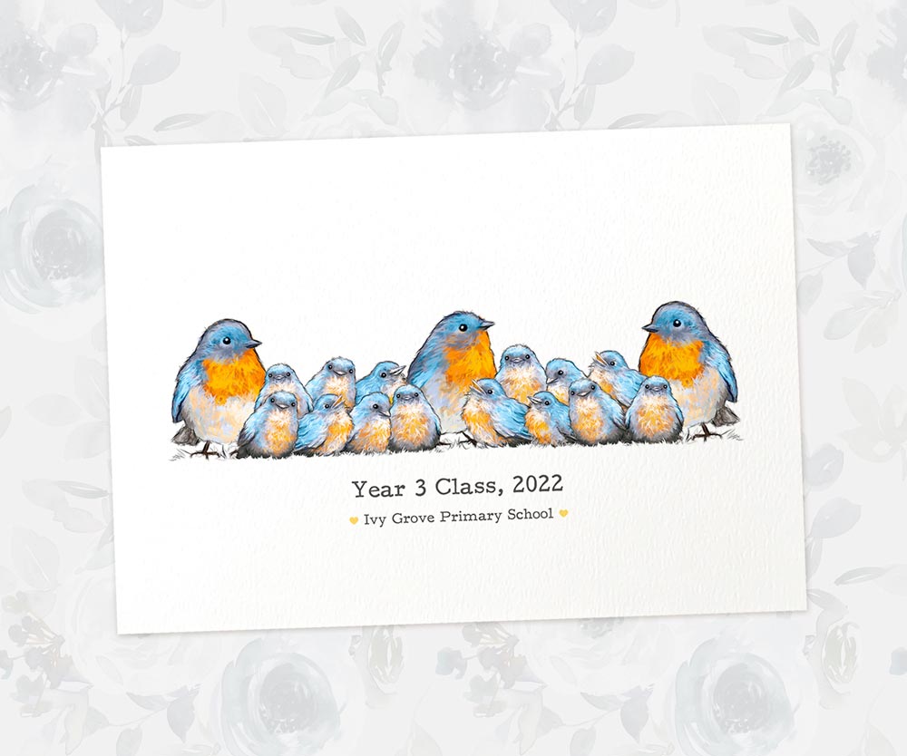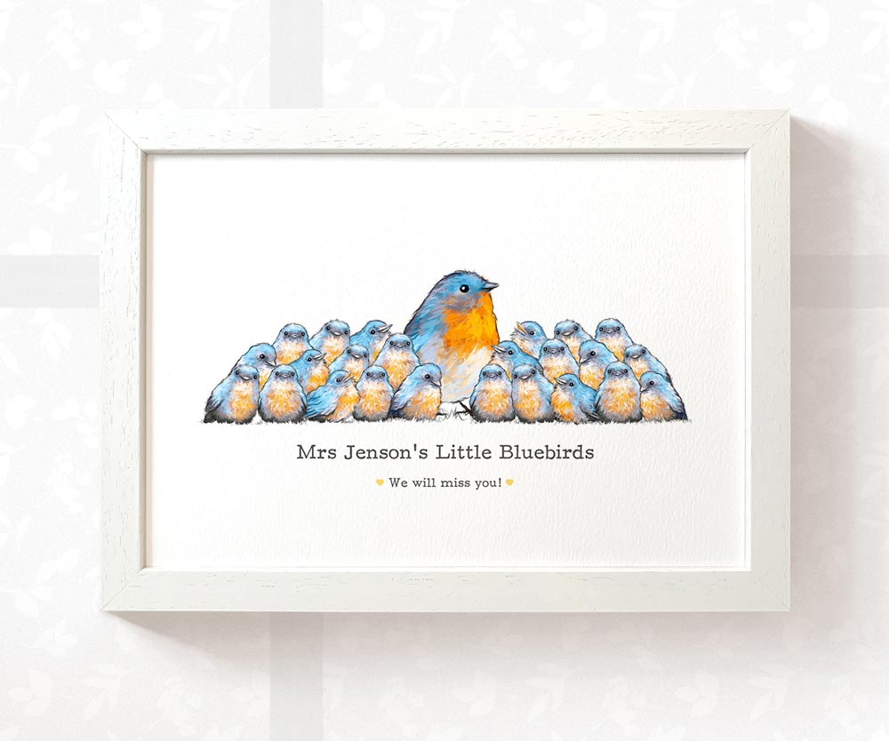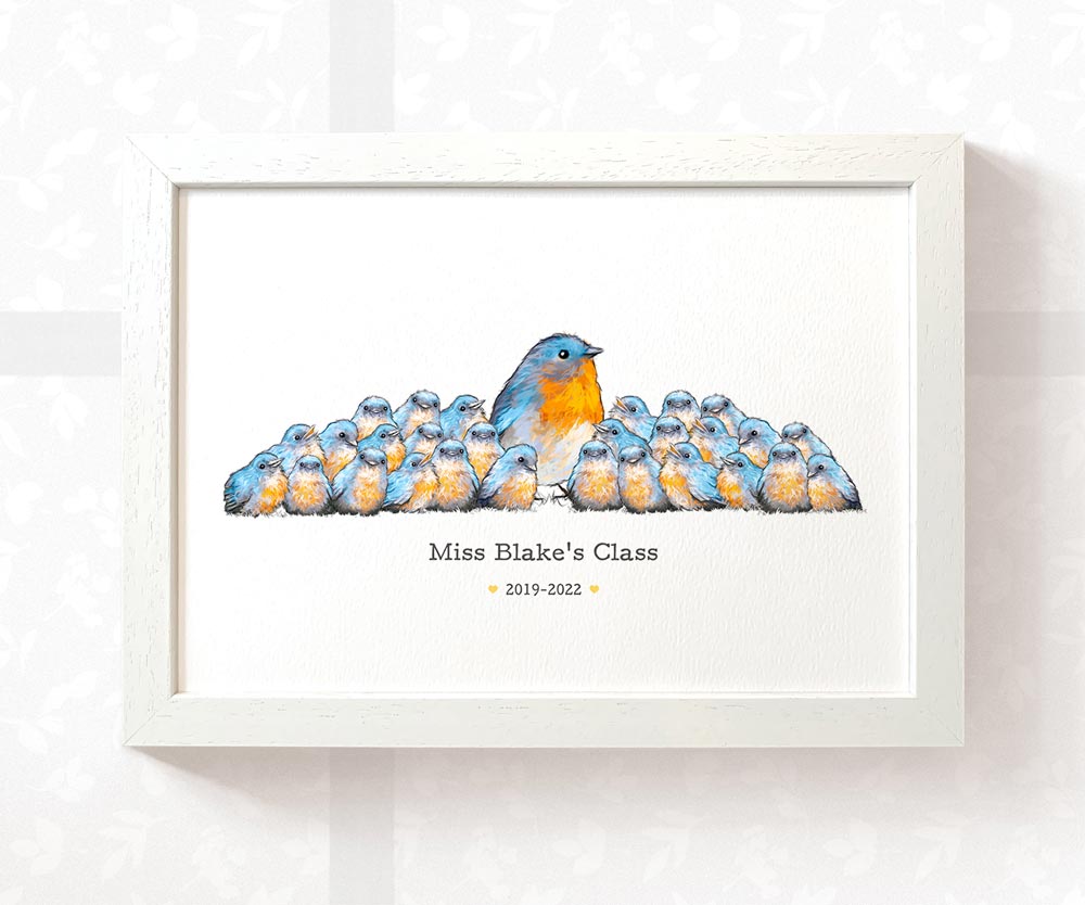 Personalize your best teacher print with any number of adult and child bluebirds, along with any message, to create the perfect customized thank you gift for your child's headteacher, tutor, or any other role model at the end of term. This personalized classroom print can feature the teacher's name, class name, quote, date, or special message, making it a truly meaningful teacher gift. Brighten any preschool classroom with a unique class portrait that all the children will love.