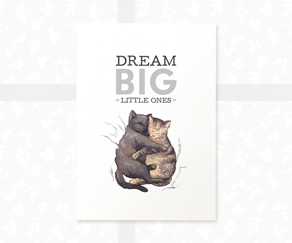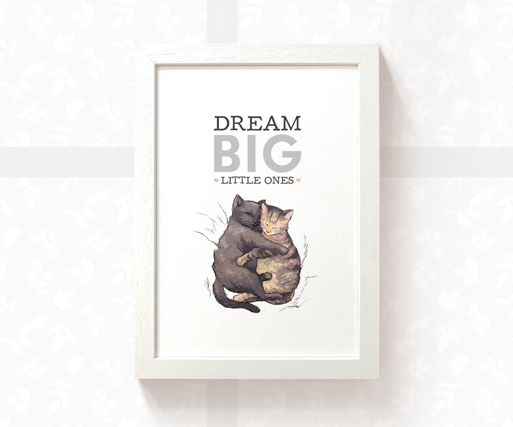 Add the perfect finishing touch to your twin nursery with this stunning baby room print featuring two cuddling cats with the phrase "Dream big little ones". It makes an ideal cat themed gift for a new mum or dad or their little ones - whether it's a first birthday gift, a baby shower gift for twins, a kitten nursery print to finish off your babys' room or a playful feature for your home.