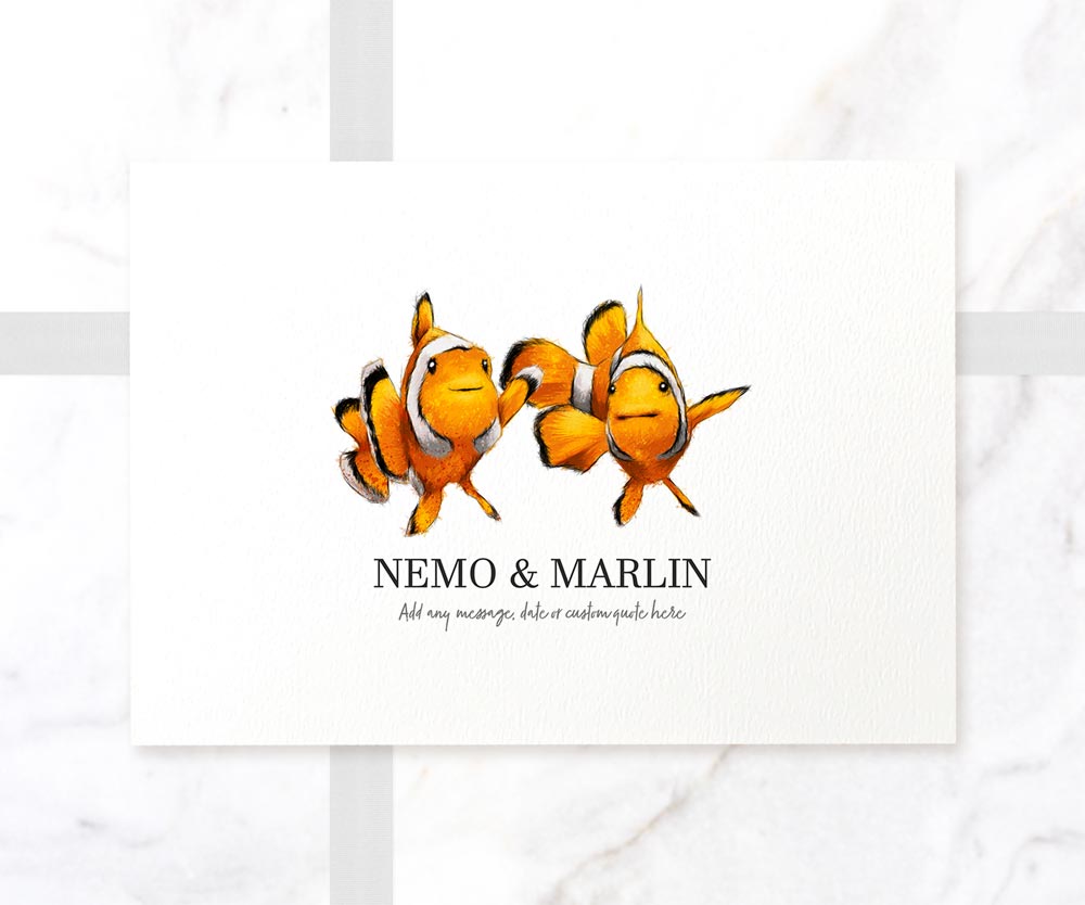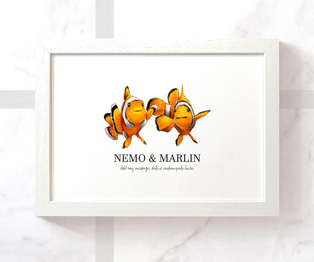 Add any name! Our personalised service allows you to add any name and message to your pet print no matter how unusual or unique. Customise your clown fish print for a cost-effective alternative to a pet portrait to complete your aquarium room decor, featuring your pets names and any quote. It makes for a unique birthday gift for clown fish keepers or can be personalised as a memorial gift for the loss of a pet.