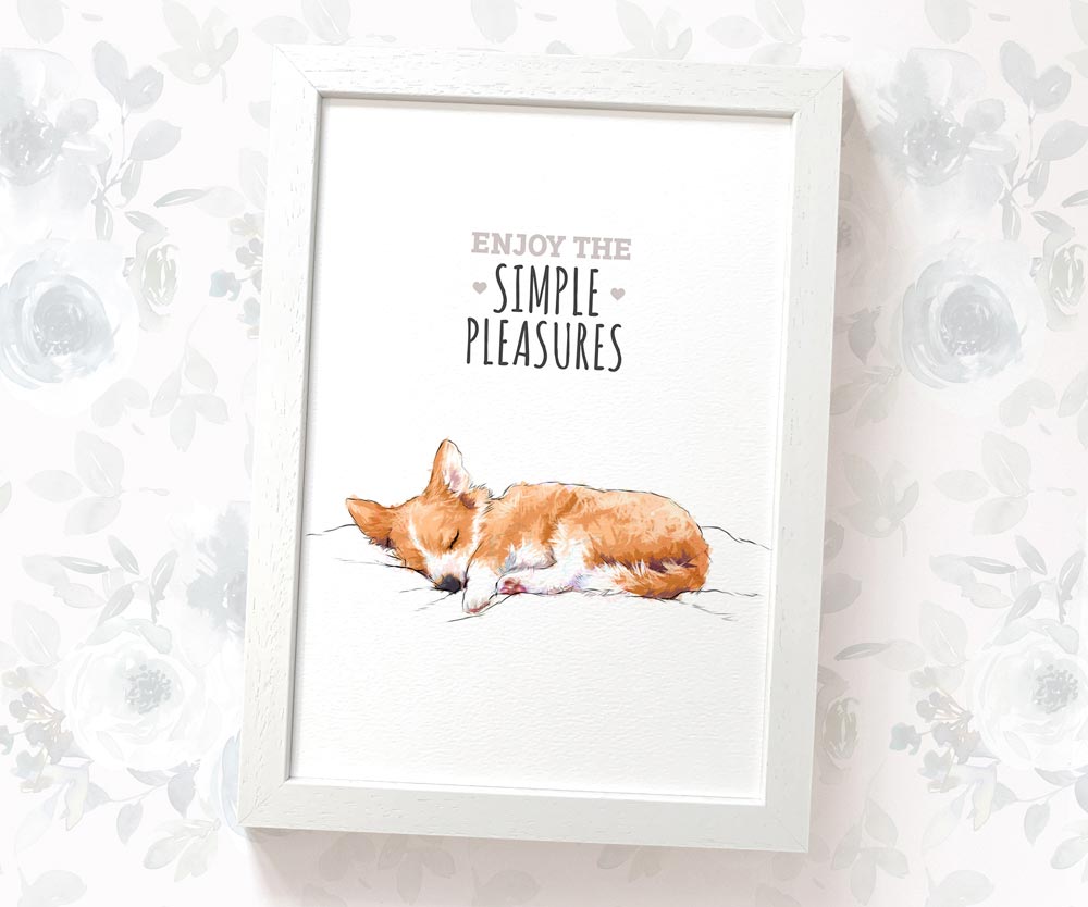 This cosy print features an adorable sleeping Corgi beneath the phrase "Enjoy the simple pleasures" - the perfect finishing touch to any dog themed room. It makes an ideal gift for anyone who would love a little boost of positivity - whether it's a birthday gift for a dog lover, a motivational housewarming gift or just a playful feature for your home.