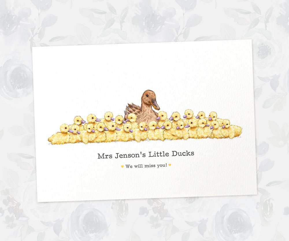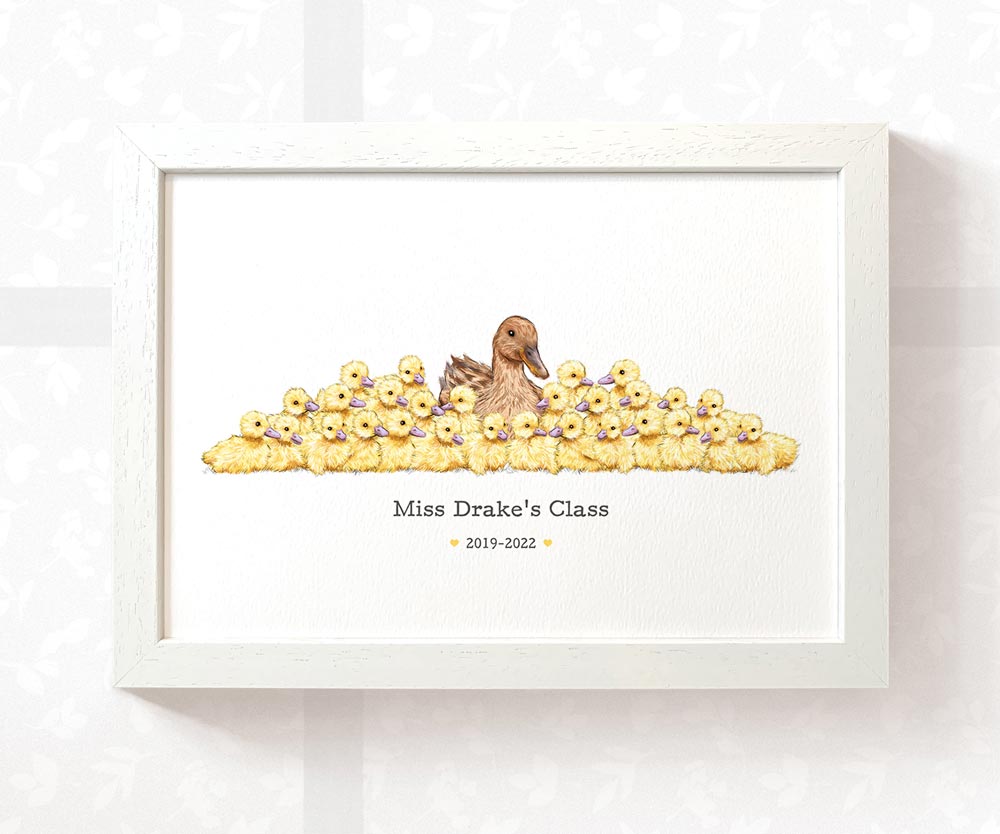 Personalize your best teacher print with any number of adult and child ducks, along with any message, to create the perfect customized thank you gift for your child's headteacher, tutor, or any other role model at the end of term. This personalized classroom print can feature the teacher's name, class name, quote, date, or special message, making it a truly meaningful teacher gift. Brighten any preschool classroom with a unique class portrait that all the children will love.
