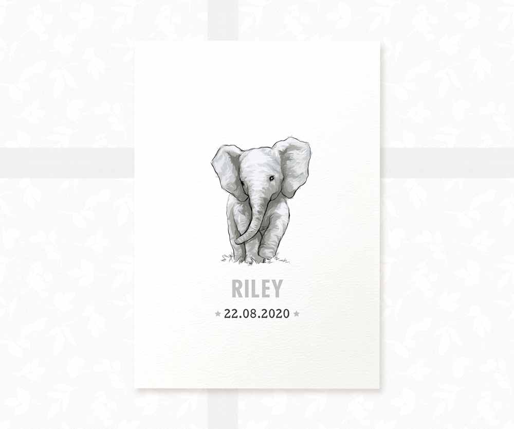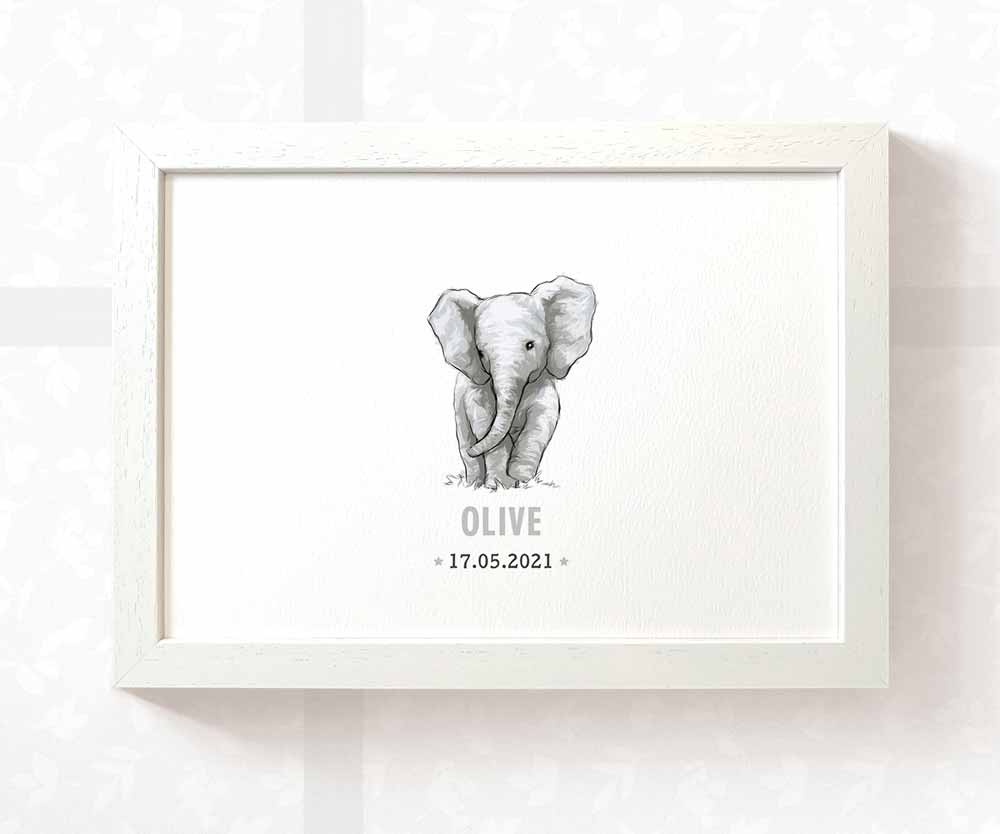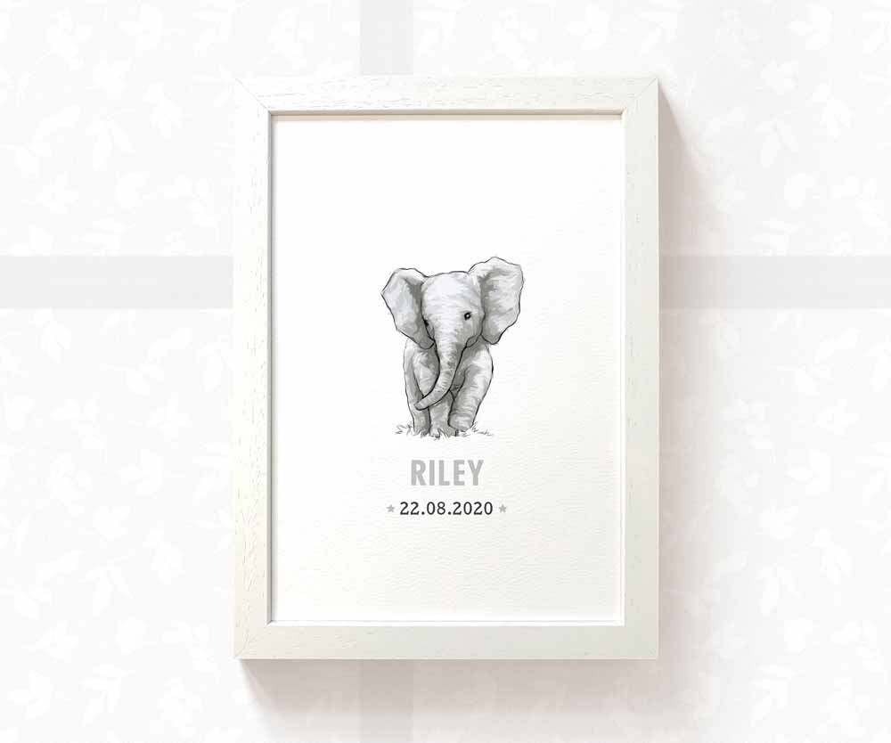 Personalise your elephant baby birth print with your baby's name and date of birth for a perfect nursery feature. Whether for a baby shower, a memorable first birthday or a homecoming gift, this adorable print will complete your safari-themed nursery decor as a lasting celebration of your little one.