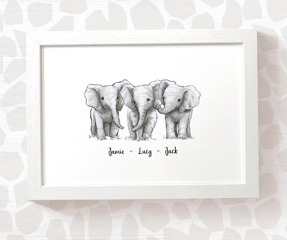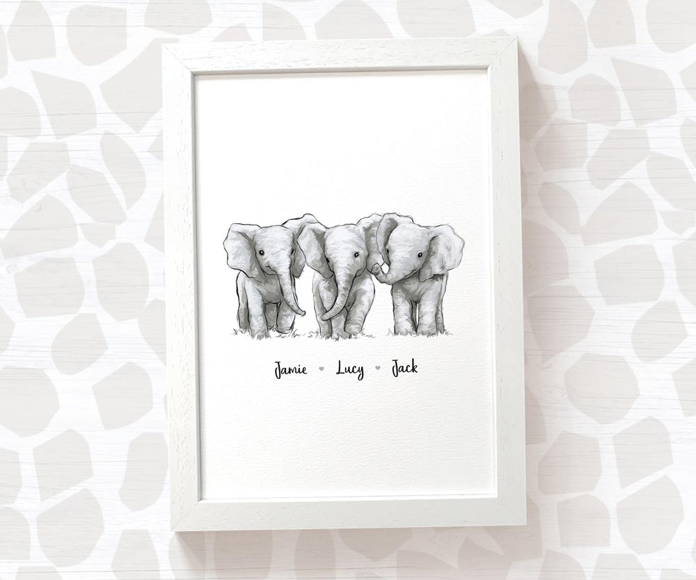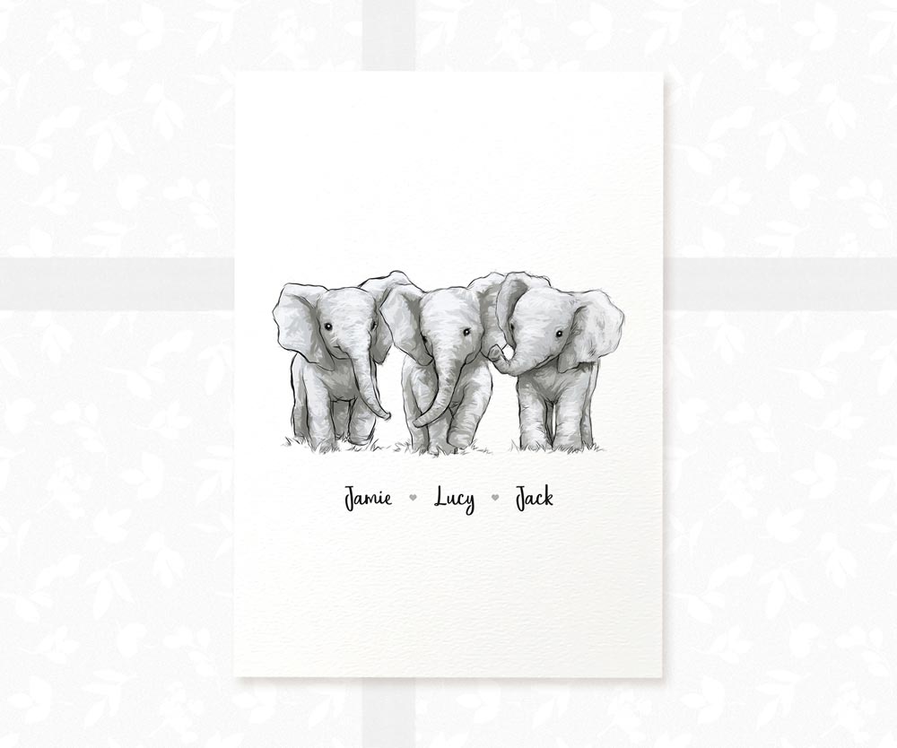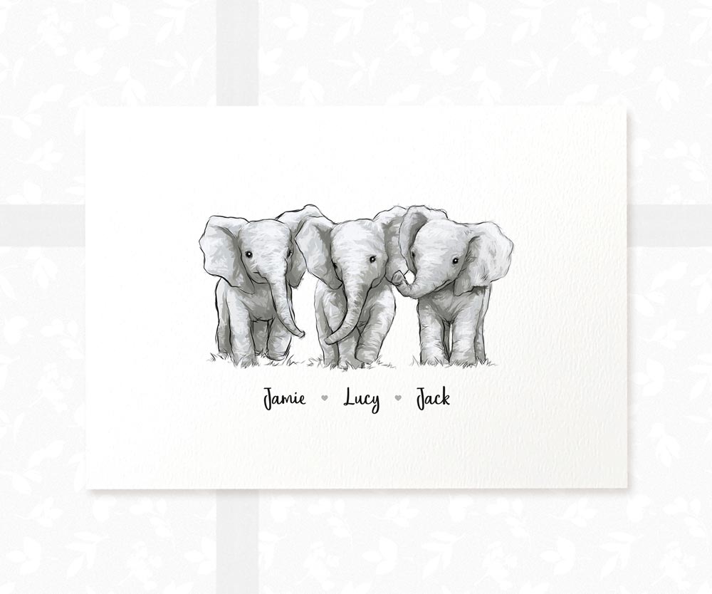 Elephant Personalised Baby Name Print for Triplets