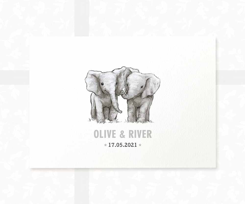 Customise your elephant baby birth print with your babies' names and date of birth for a perfect twin nursery feature. Ideal as a twin welcome gift for new parents or a baby shower present. Whether for a memorable first birthday or a homecoming gift, this adorable print will complete your safari-themed nursery decor as a lasting celebration of your children.