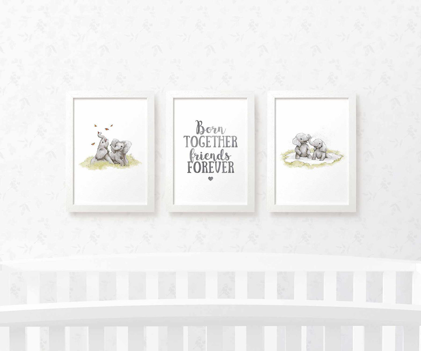 This gorgeous elephant nursery set of 3 prints is the perfect gift for expecting parents or to welcome twins. Your set of prints will include twin baby elephants playing with butterflies and splashing in a puddle, with the central quote "Born together, Friends forever". Ideal as a first birthday gift or gender-neutral twin baby shower gift, these prints will complete your elephant-themed baby room.