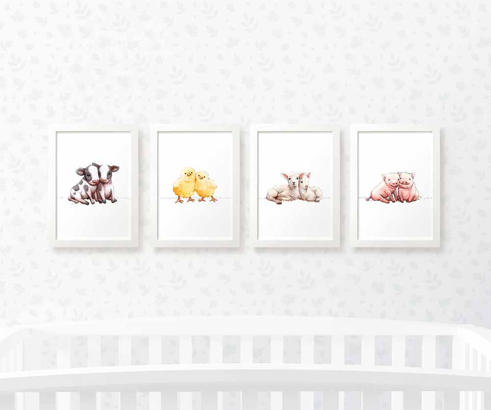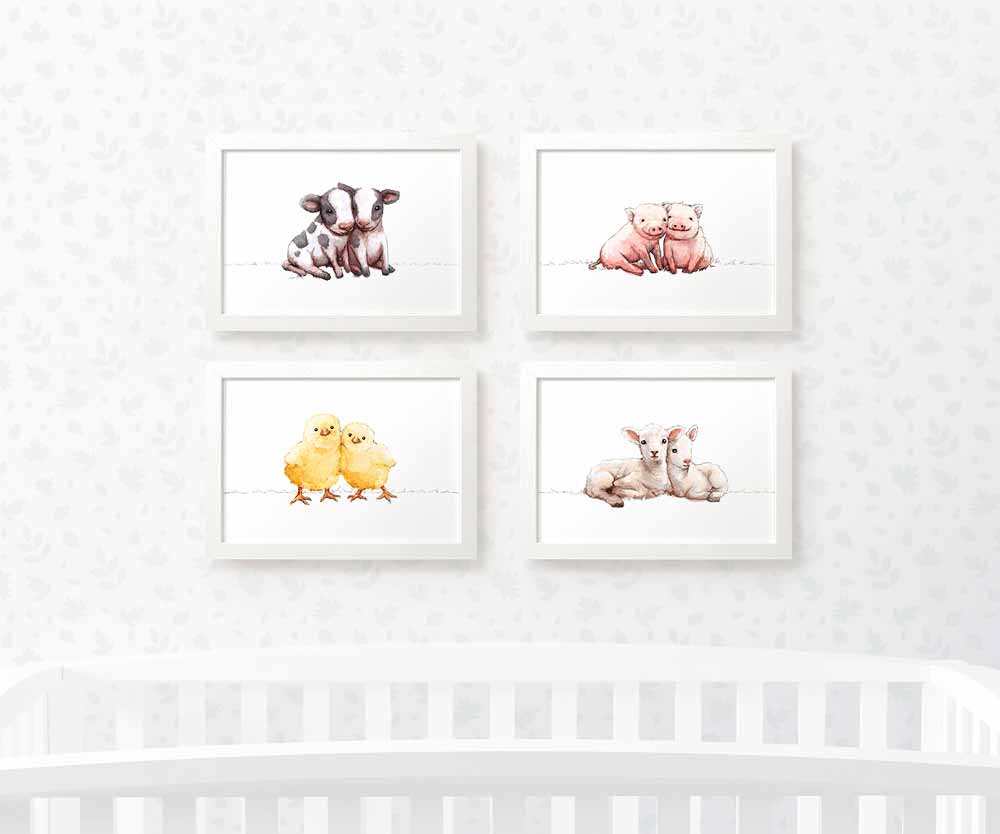 This gorgeous farm animal nursery set of 4 prints is the perfect gift for expecting parents or to welcome twins. Your set of prints will include twin pigs, cows, lambs and chicks. Ideal as a first birthday gift or gender-neutral twin baby shower gift, these prints will complete your farm animal-themed baby room.