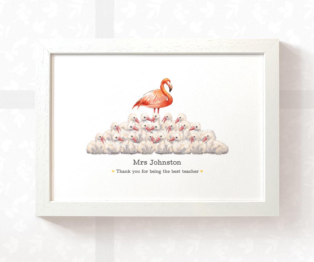 Personalize your best teacher print with any number of adult and child flamingos, along with any message, to create the perfect customized thank you gift for your child's headteacher, tutor, or any other role model at the end of term. This personalized classroom print can feature the teacher's name, class name, quote, date, or special message, making it a truly meaningful teacher gift. Brighten any preschool classroom with a unique class portrait that all the children will love.