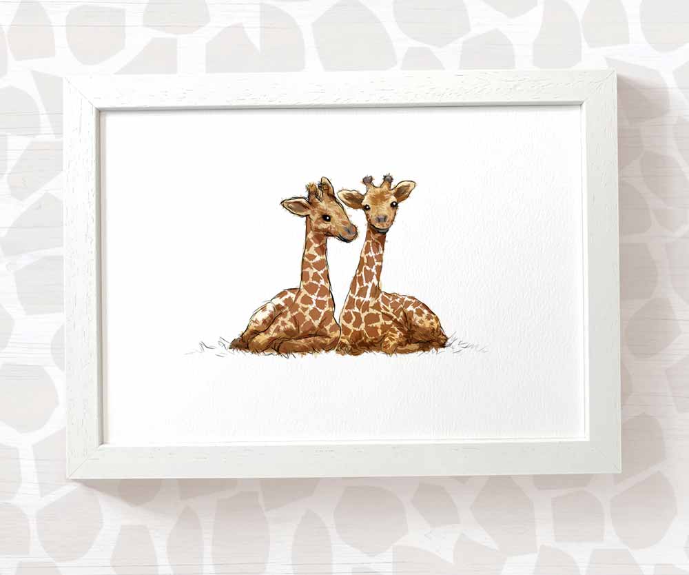 This safari animal wall art print featuring twin baby giraffes makes the perfect addition to your little ones' safari nursery decor, whether you're looking for twin safari baby shower gift ideas to welcome newborns into the world or a present for new mums and dads to complete their twinnies safari themed playroom decor.