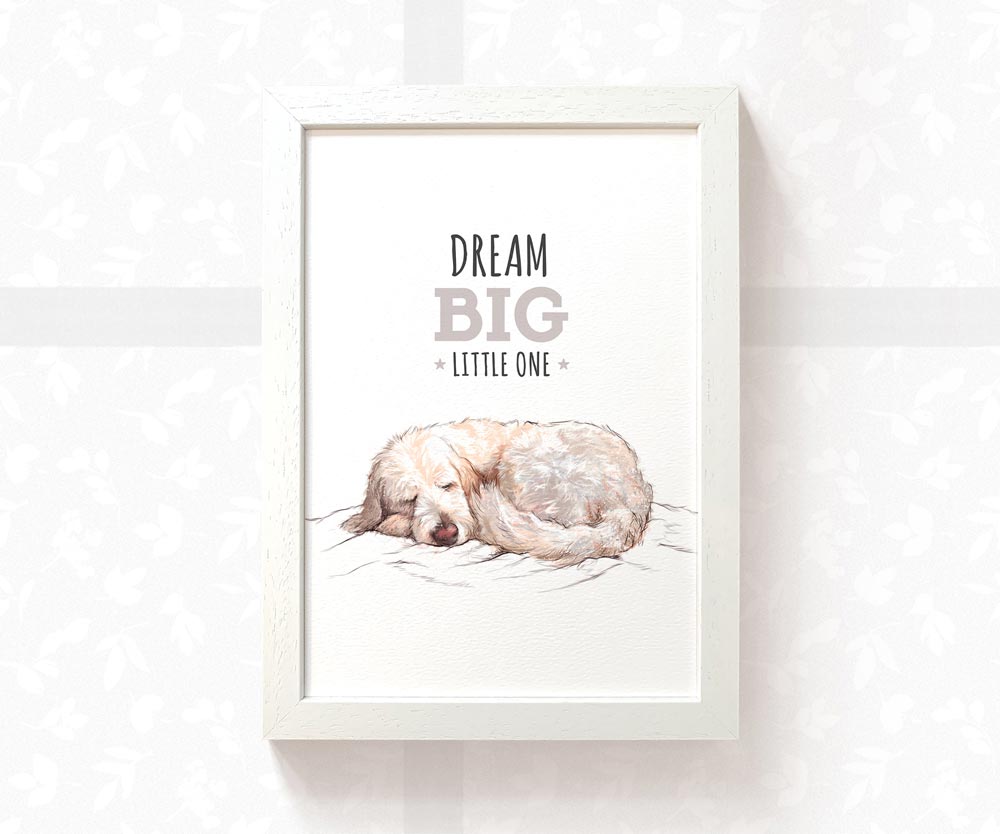 Add the perfect finishing touch to your dog themed nursery with this stunning goldendoodle baby room print, featuring the phrase "Dream big little one". It makes an ideal puppy themed gift for a new mum or dad or their little one - whether it's a first birthday gift, a baby shower gift, a dog nursery print to finish off your baby's room or a playful feature for your home.