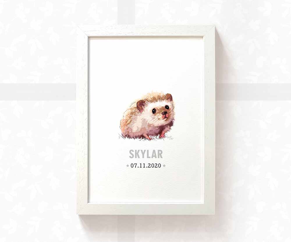 Personalise your hedgehog baby birth print with your baby's name and date of birth for a perfect nursery feature. Whether for a baby shower, a memorable first birthday or a homecoming gift, this adorable print will complete your woodland-themed nursery decor as a lasting celebration of your little one.