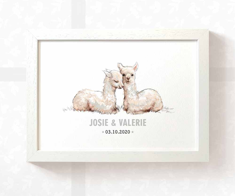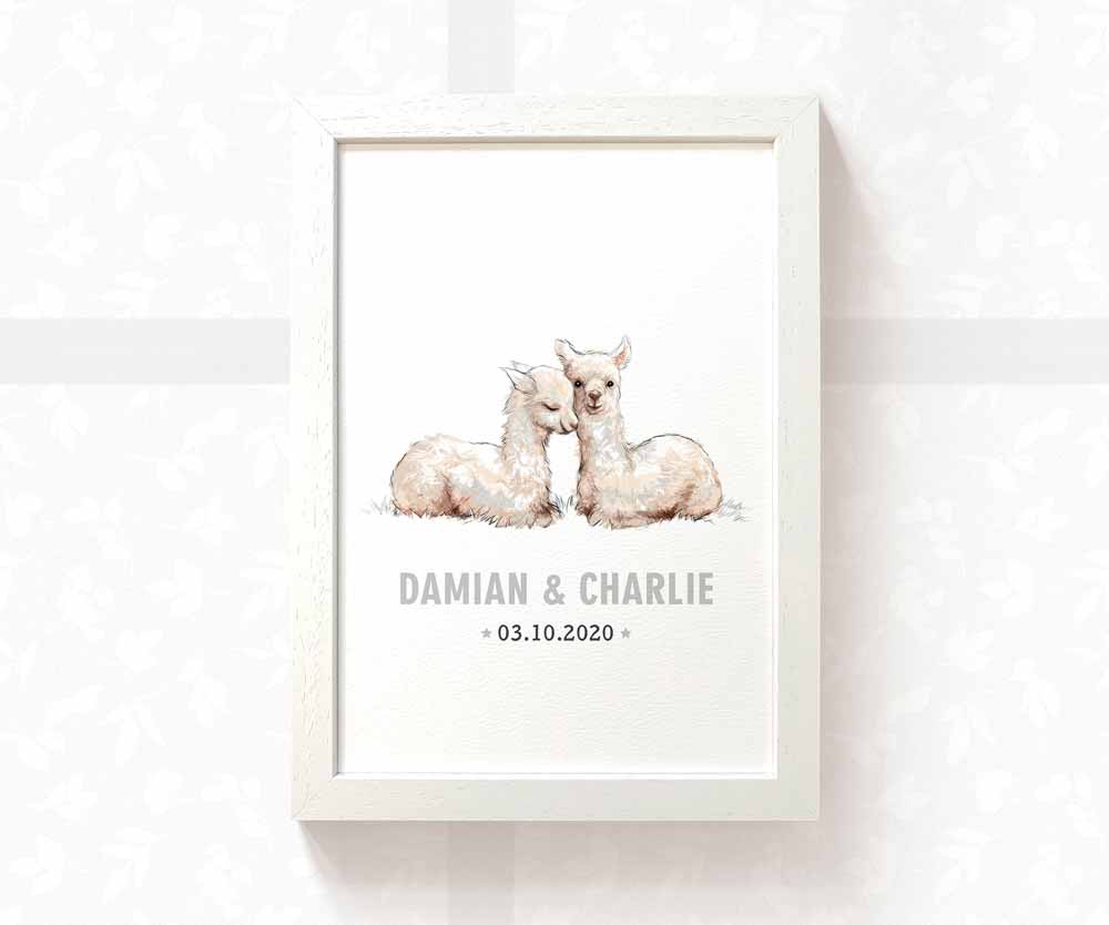 Customise your llama baby birth print with your babies' names and date of birth for a perfect twin nursery feature. Ideal as a twin welcome gift for new parents or a baby shower present. Whether for a memorable first birthday or a homecoming gift, this adorable print will complete your farm animal-themed nursery decor as a lasting celebration of your children.