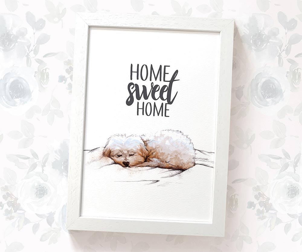 This cosy print features an adorable sleeping maltese dog beneath the phrase "Home sweet home" - the perfect finishing touch to any dog themed room. It makes an ideal gift for anyone who would love a little boost of positivity - whether it's a birthday gift for a dog lover, a motivational housewarming gift or just a playful feature for your home.