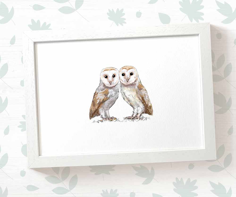 Add the perfect finishing touch to your woodland-themed twin nursery with this stunning barn owl print. It makes an ideal forest themed gift for a new mum or dad or their little ones - whether it's a first birthday gift, a twin baby shower gift, a woodland bird nursery print to finish off your babys' room or a playful feature for your home.