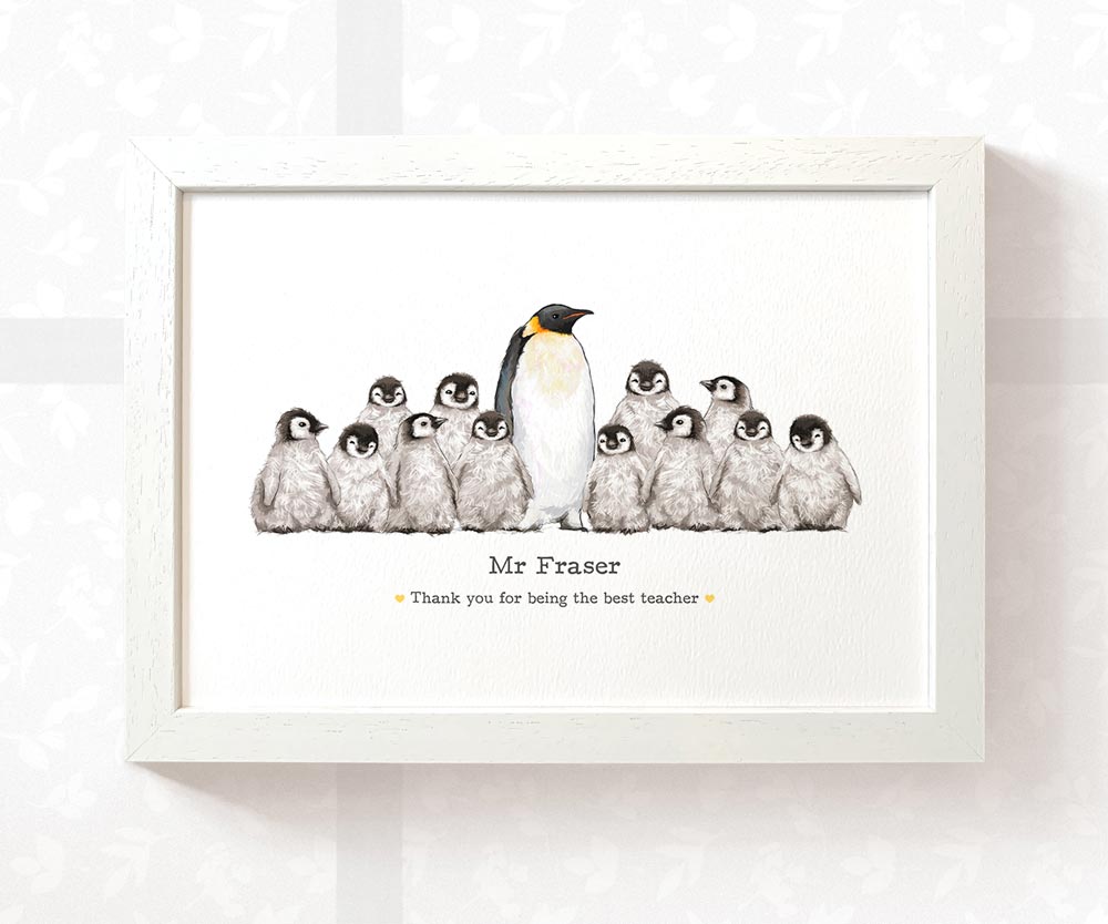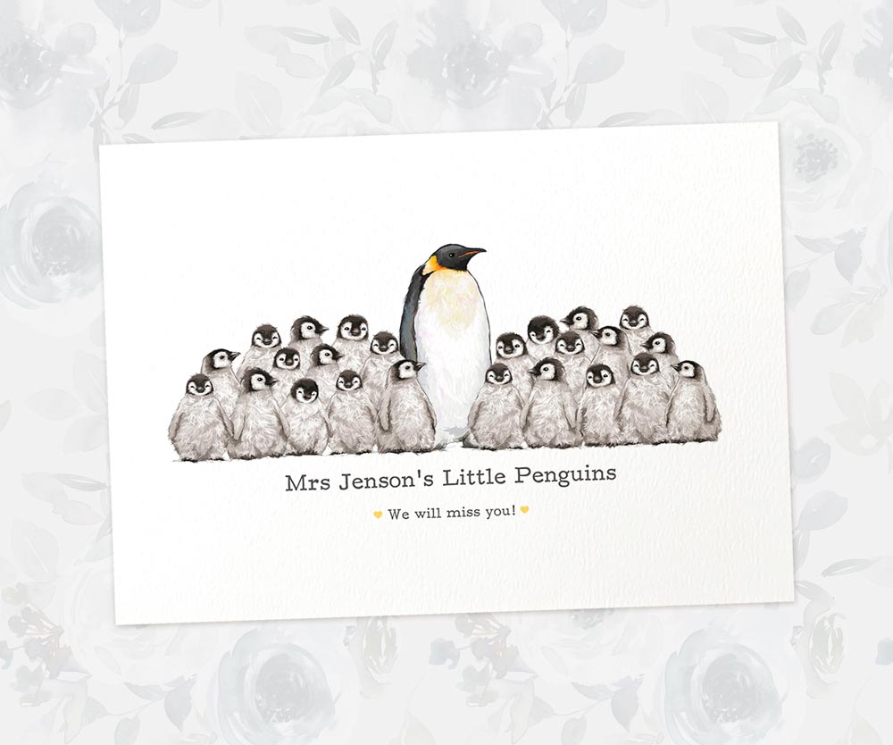 Personalize your best teacher print with any number of adult and child penguins, along with any message, to create the perfect customized thank you gift for your child's headteacher, tutor, or any other role model at the end of term. This personalized classroom print can feature the teacher's name, class name, quote, date, or special message, making it a truly meaningful teacher gift. Brighten any preschool classroom with a unique class portrait that all the children will love.