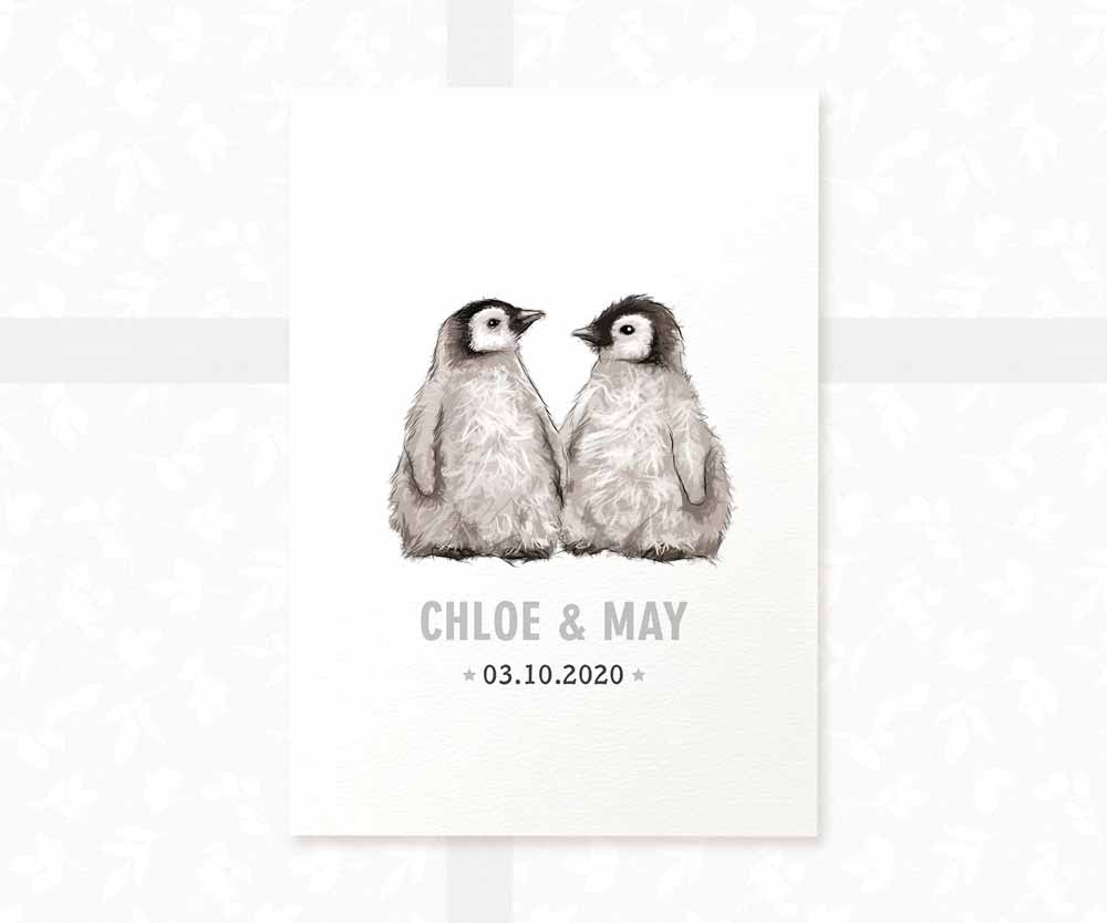 Penguin Personalised Baby Name Print for Twins