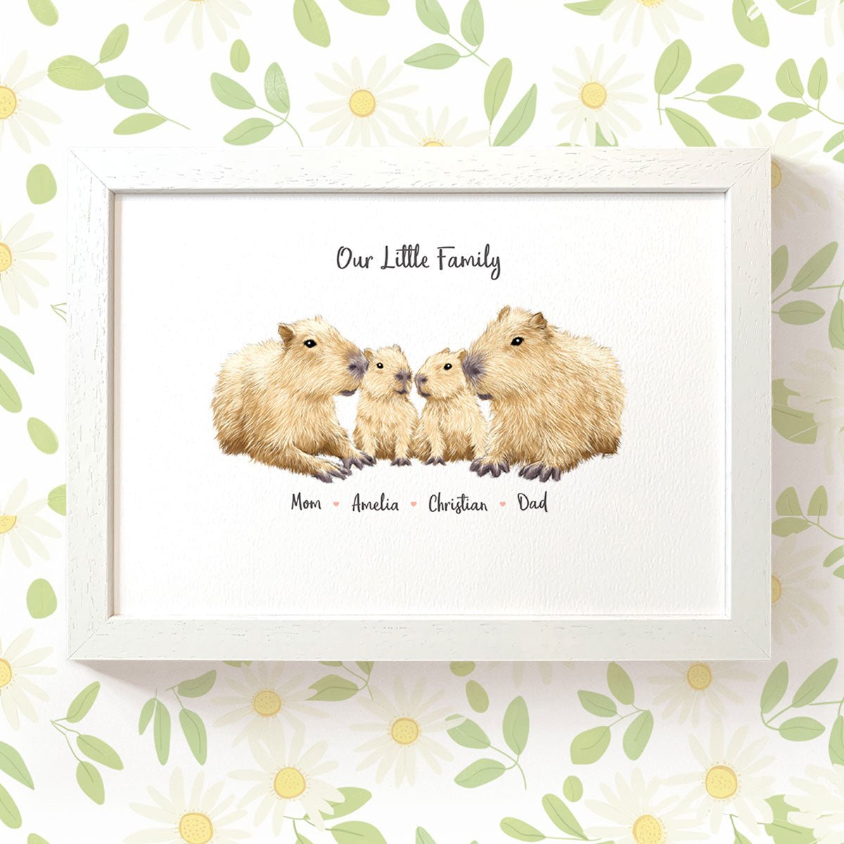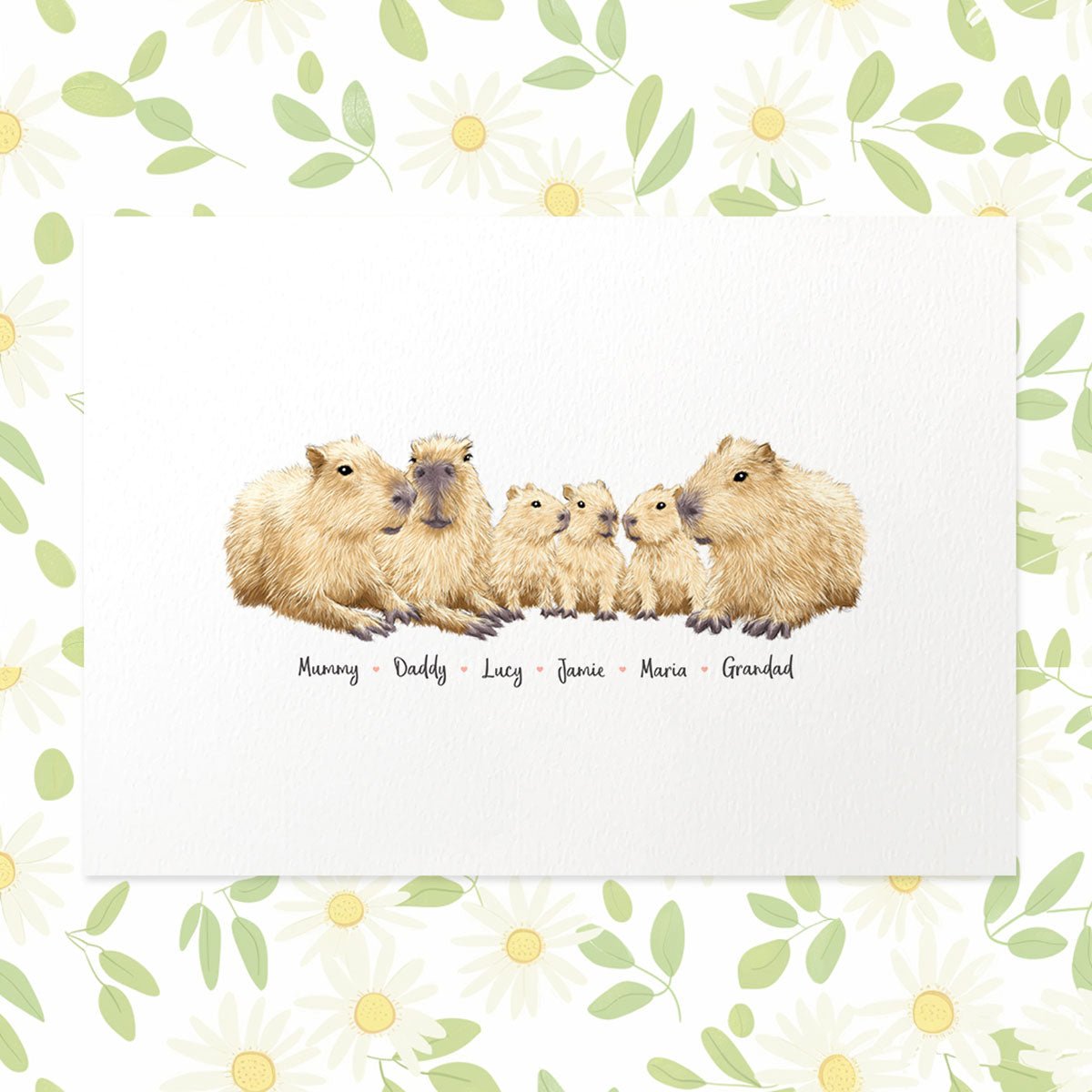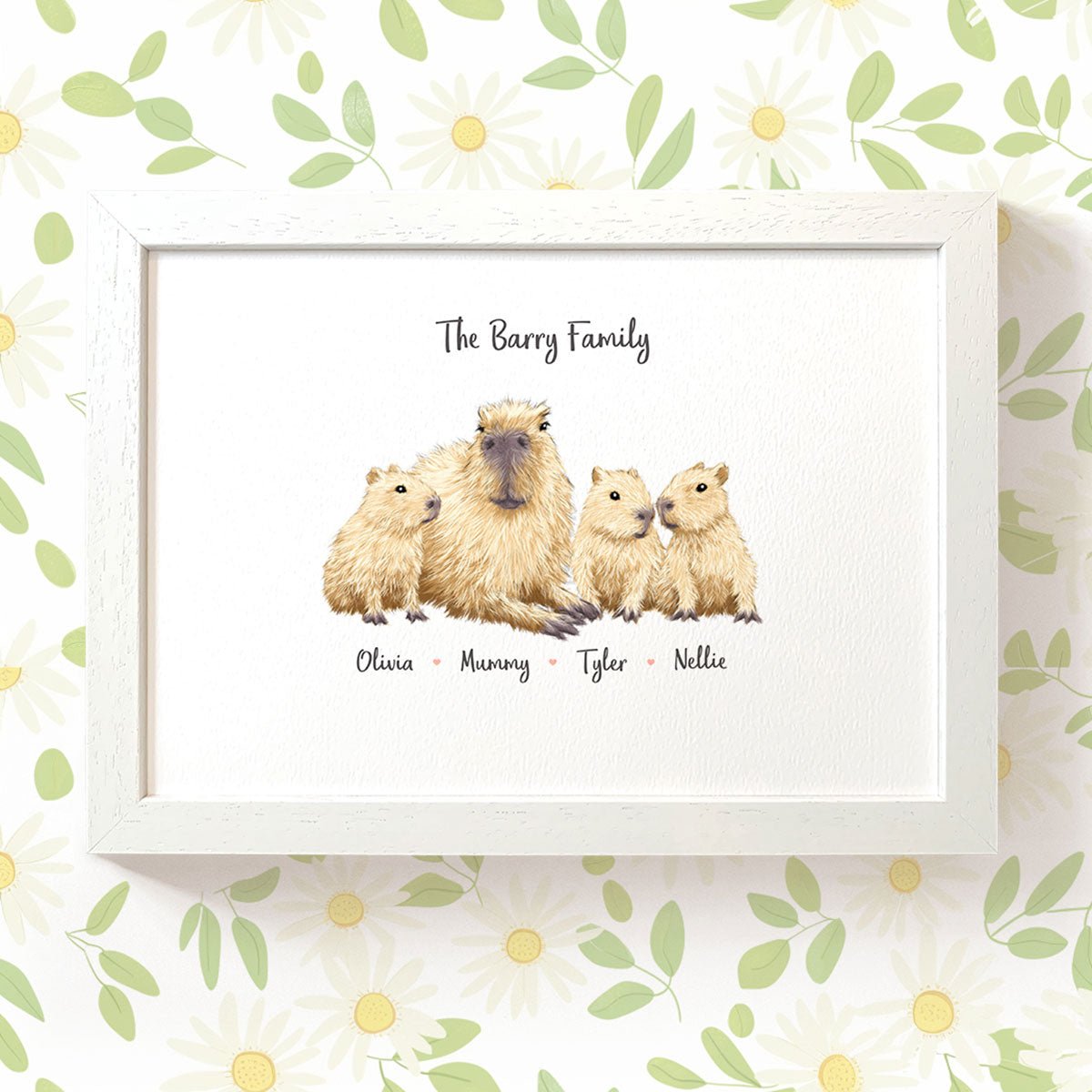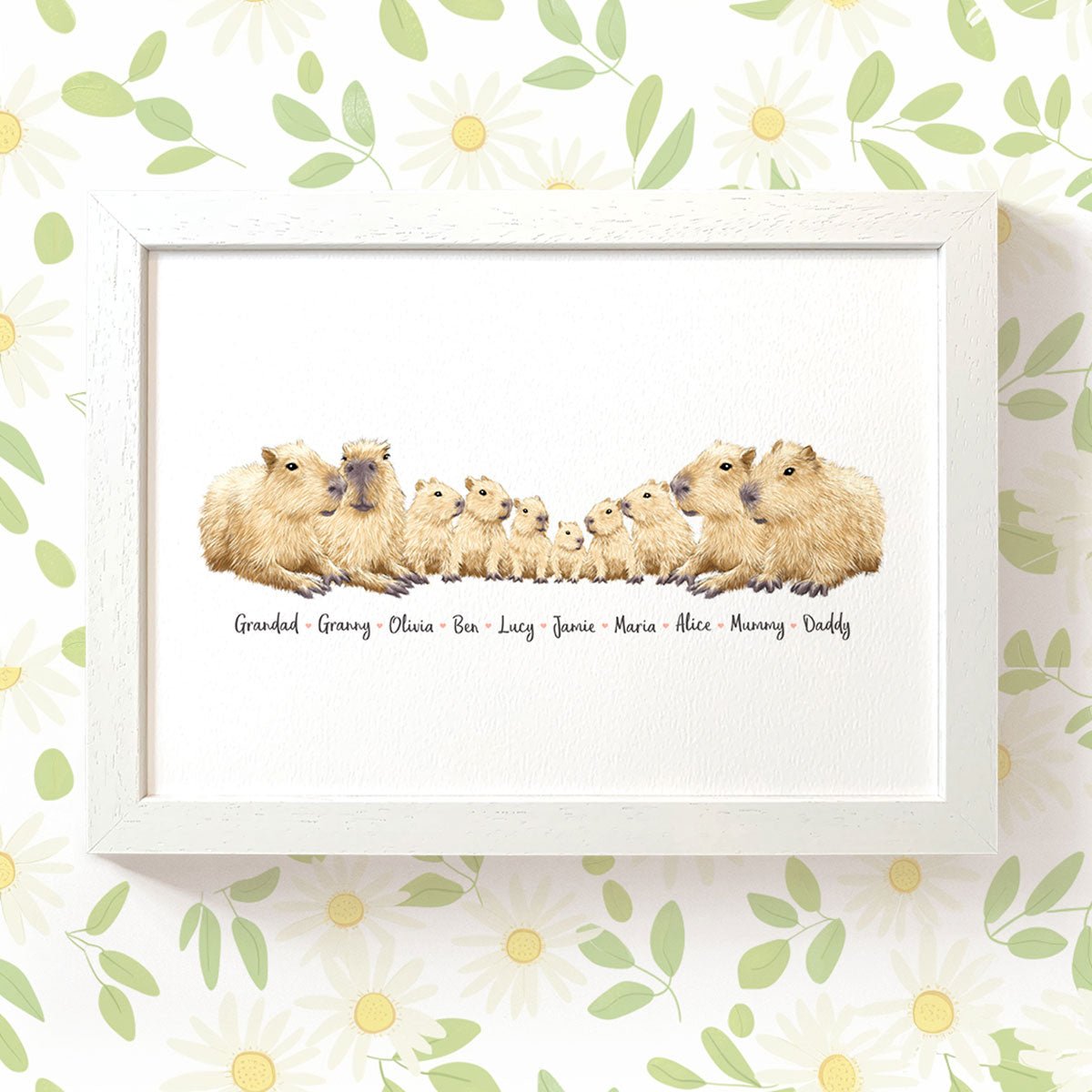 Customise your capybara print with your family or friends' names for a quirky and special personalised gift. It's perfect for any occasion - whether it's a cavy themed birthday gift, mothers or fathers day present, 50th anniversary gift, wildlife print for your baby's room, a new baby gift or a family feature for your own home.
