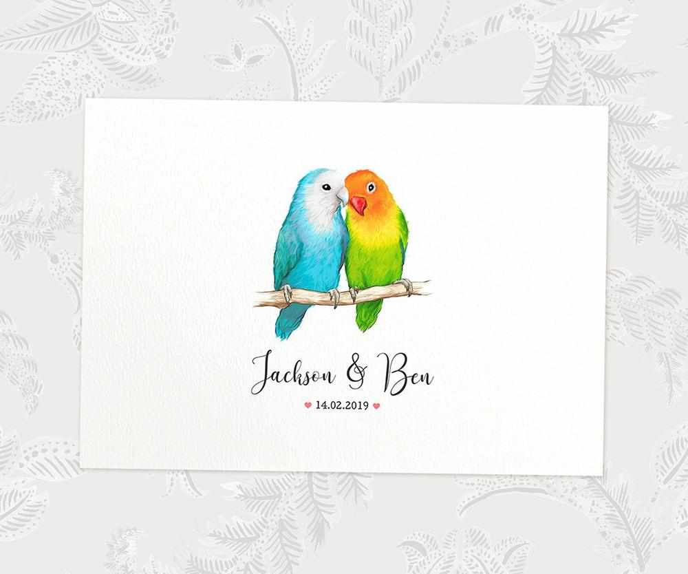 Personalise your lovebird couple print with names, date or any message you'd like for the perfect wedding day or anniversary keepsake. It would make a wonderful First Anniversary traditional paper gift to celebrate 1 year together or married, or marks the date for any special milestone - whether it's a wedding gift for newlyweds, anniversary gift for lovebird lovers, an engagement present or a celebratory piece for your own home.