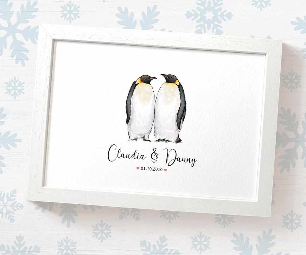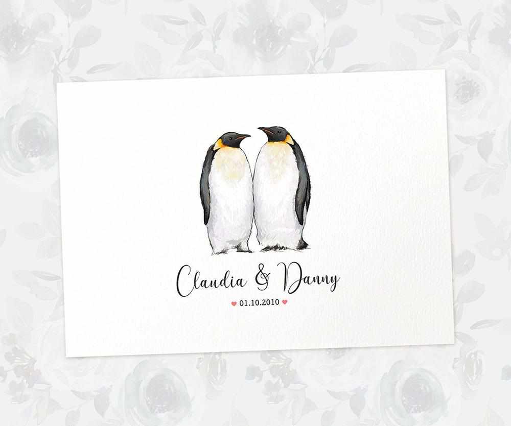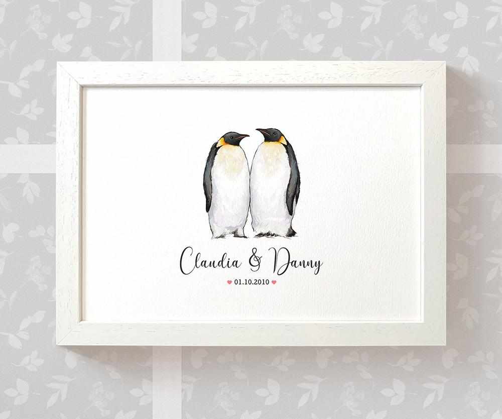 Personalise your penguin couple print with any names, date or message you'd like, for a stunning anniversary or wedding day keepsake. It would make a wonderful First Anniversary traditional paper gift to celebrate 1 year together or married, or marks the date for any special milestone - whether it's a wedding gift for newlyweds, anniversary gift for Emperor Penguin lovers, an engagement present or a celebratory piece for your own home.