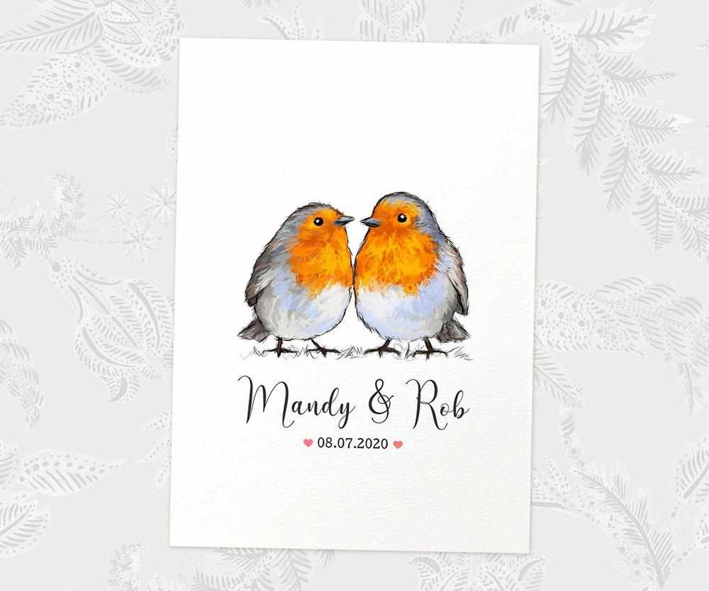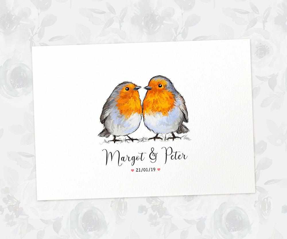 Personalise your robin couple print with names, date or any meaningful quote you'd like, for a stunning anniversary or wedding day keepsake. It would make a wonderful First Anniversary traditional paper gift to celebrate 1 year together or married, or marks the date for any special milestone - whether it's a wedding gift for newlyweds, anniversary gift for Robin lovers, an engagement present or a celebratory piece for your own home.