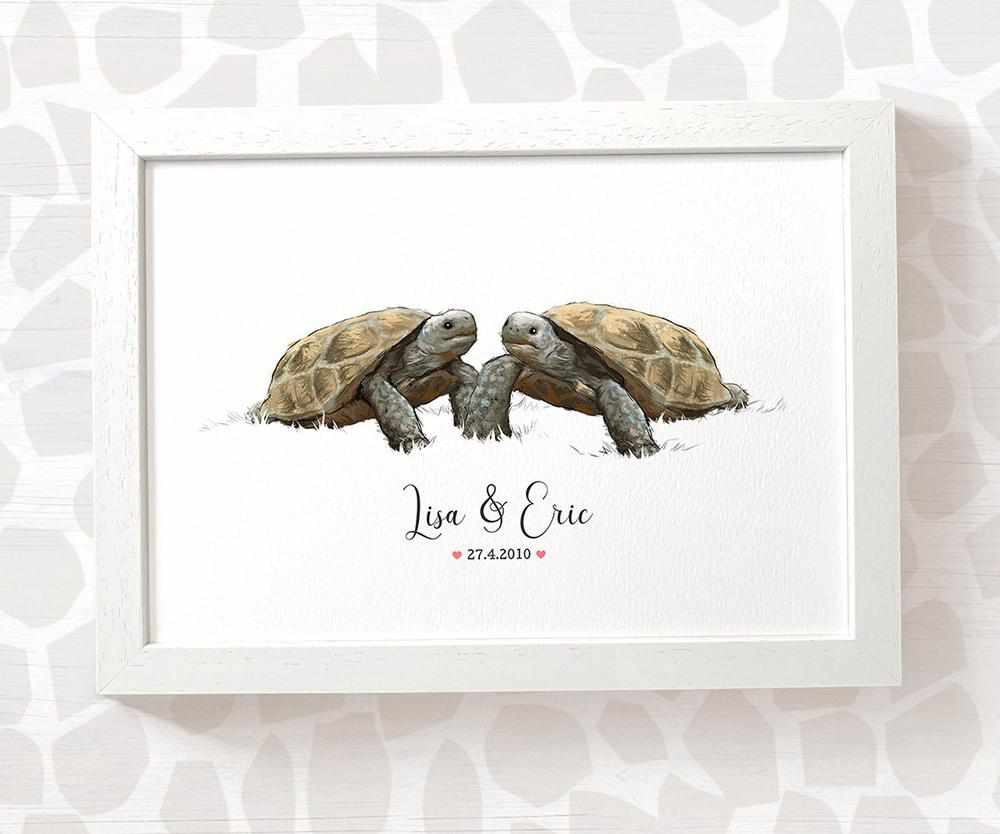 Personalise your tortoise couple print with names, date or any meaningful quote you'd like, for a stunning anniversary or wedding day keepsake. It would make a wonderful First Anniversary traditional paper gift to celebrate 1 year together or married, or marks the date for any special milestone - whether it's a wedding gift for newlyweds, anniversary gift for Tortoise lovers, an engagement present or a celebratory piece for your own home.