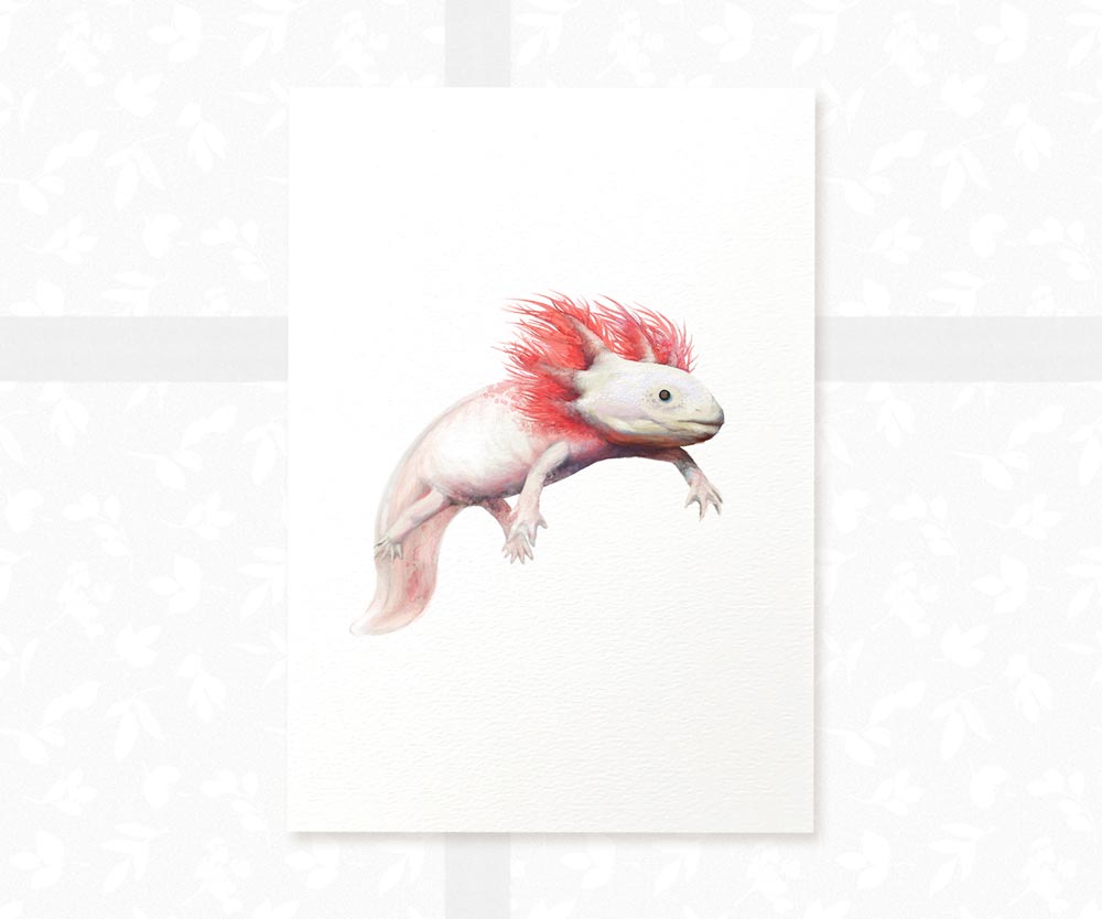 Add the perfect finishing touch to your animal themed nursery with this stunning Leucistic (Pink) Axolotl print. It makes an ideal amphibian themed gift for a new mum or dad or their little one - whether it's a first birthday gift, a baby shower gift, an aquatic nursery print to finish off your baby's room or a playful feature for your home.