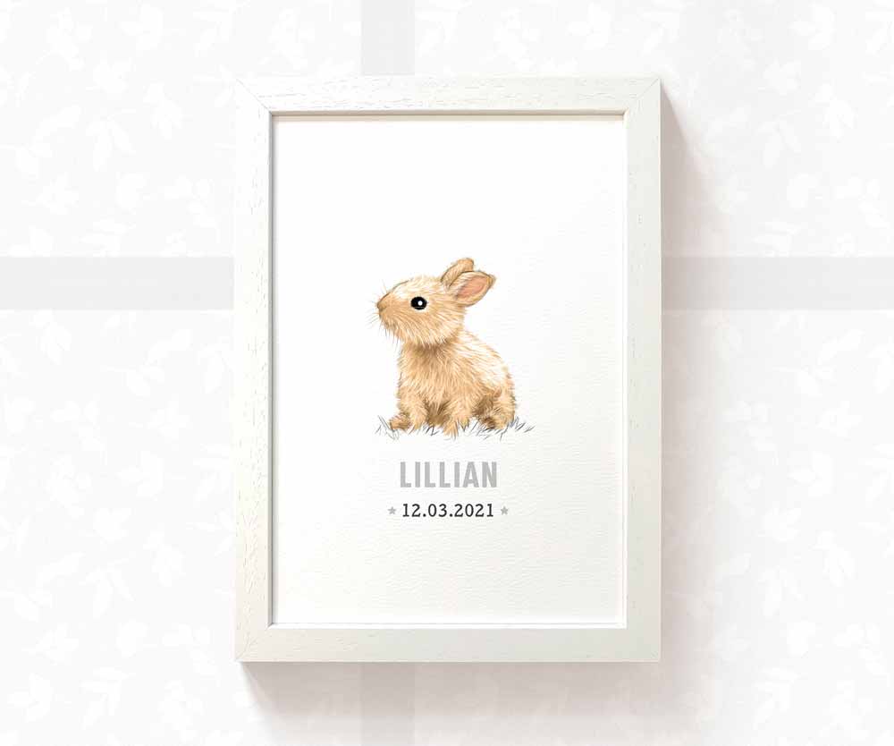 Personalise your rabbit baby birth print with your baby's name and date of birth for a perfect nursery feature. Whether for a baby shower, a memorable first birthday or a homecoming gift, this adorable print will complete your woodland-themed nursery decor as a lasting celebration of your little one.