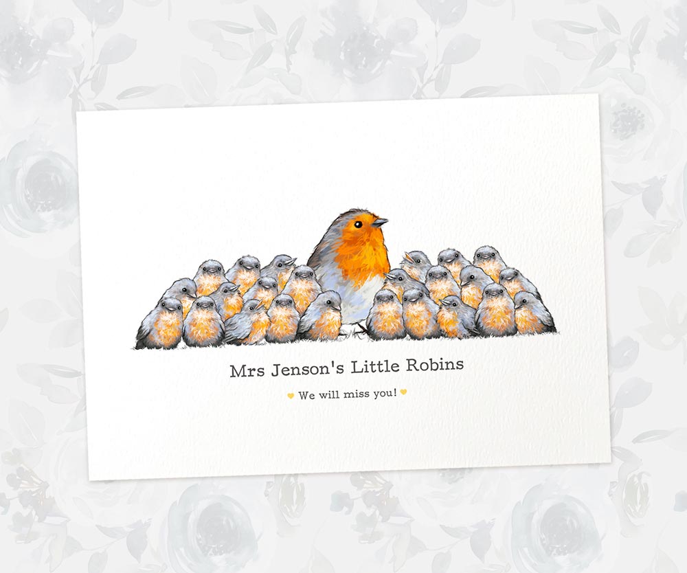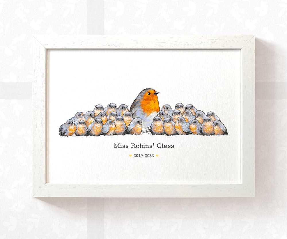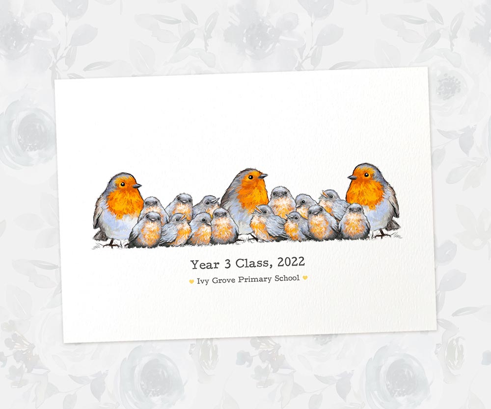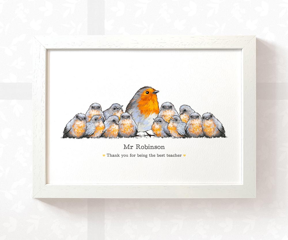 Personalize your best teacher print with any number of adult and child robins, along with any message, to create the perfect customized thank you gift for your child's headteacher, tutor, or any other role model at the end of term. This personalized classroom print can feature the teacher's name, class name, quote, date, or special message, making it a truly meaningful teacher gift. Brighten any preschool classroom with a unique class portrait that all the children will love.