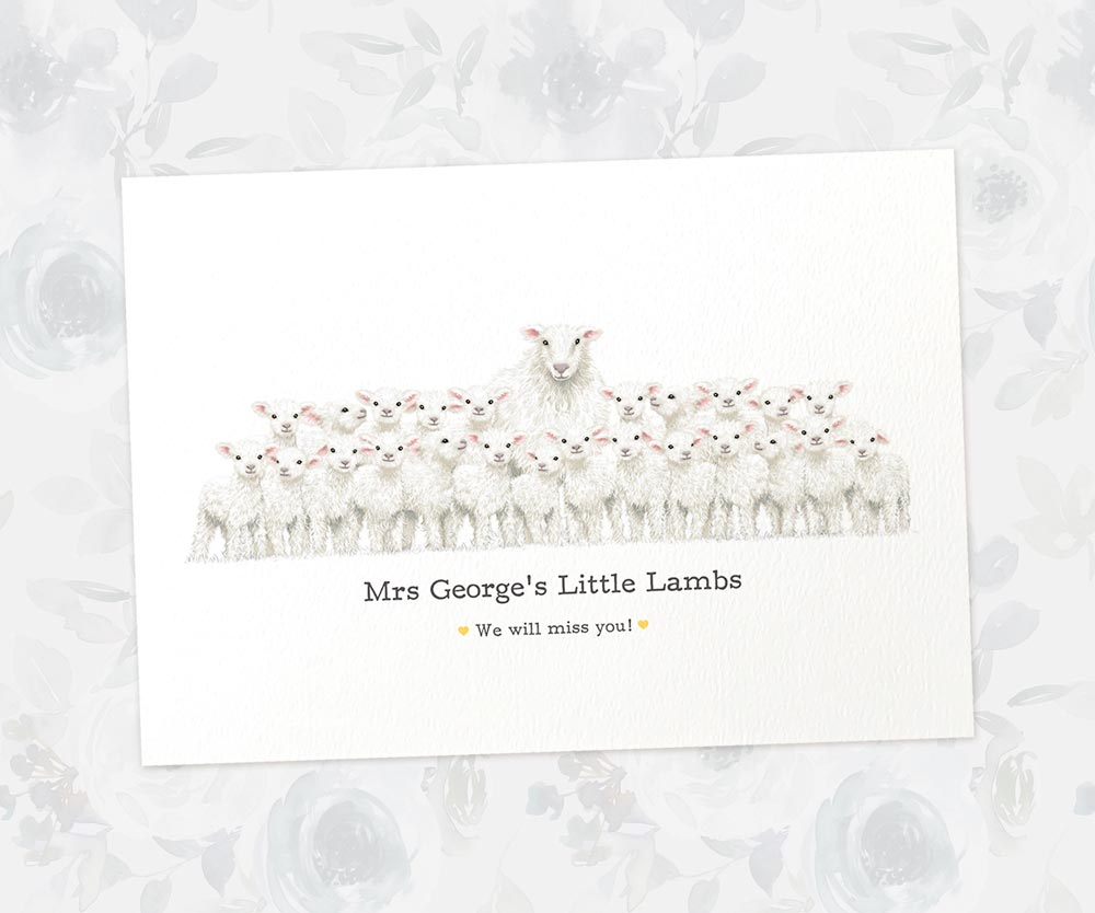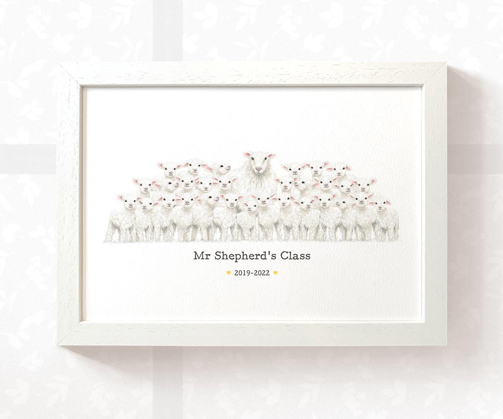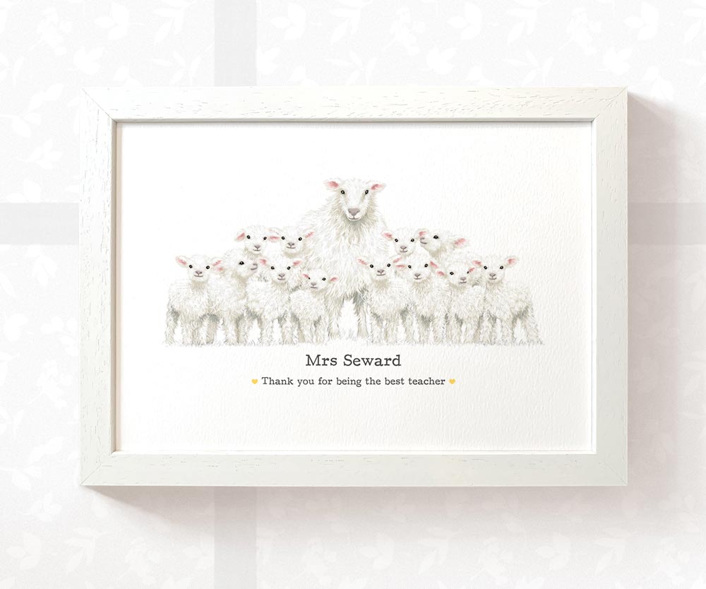 Personalize your best teacher print with any number of adult and child sheep, along with any message, to create the perfect customized thank you gift for your child's headteacher, tutor, or any other role model at the end of term. This personalized classroom print can feature the teacher's name, class name, quote, date, or special message, making it a truly meaningful teacher gift. Brighten any preschool classroom with a unique class portrait that all the children will love.