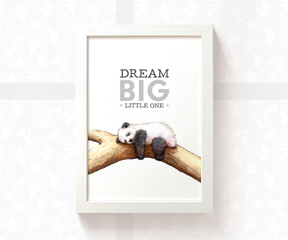 This adorable print features a gorgeous panda sleeping beneath the phrase "Dream big little one", the perfect finishing touch to any jungle themed children's room or nursery. It makes an ideal panda themed gift for a new mum or dad or their little one - whether it's a first birthday gift, a baby shower gift, a zoo animal nursery print to finish off your baby's room or a playful feature for your home.