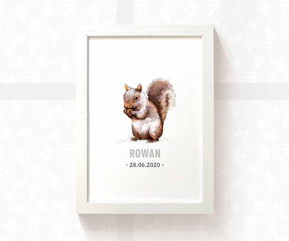 Personalise your squirrel baby birth print with your baby's name and date of birth for a perfect nursery feature. Whether for a baby shower, a memorable first birthday or a homecoming gift, this adorable print will complete your woodland-themed nursery decor as a lasting celebration of your little one.