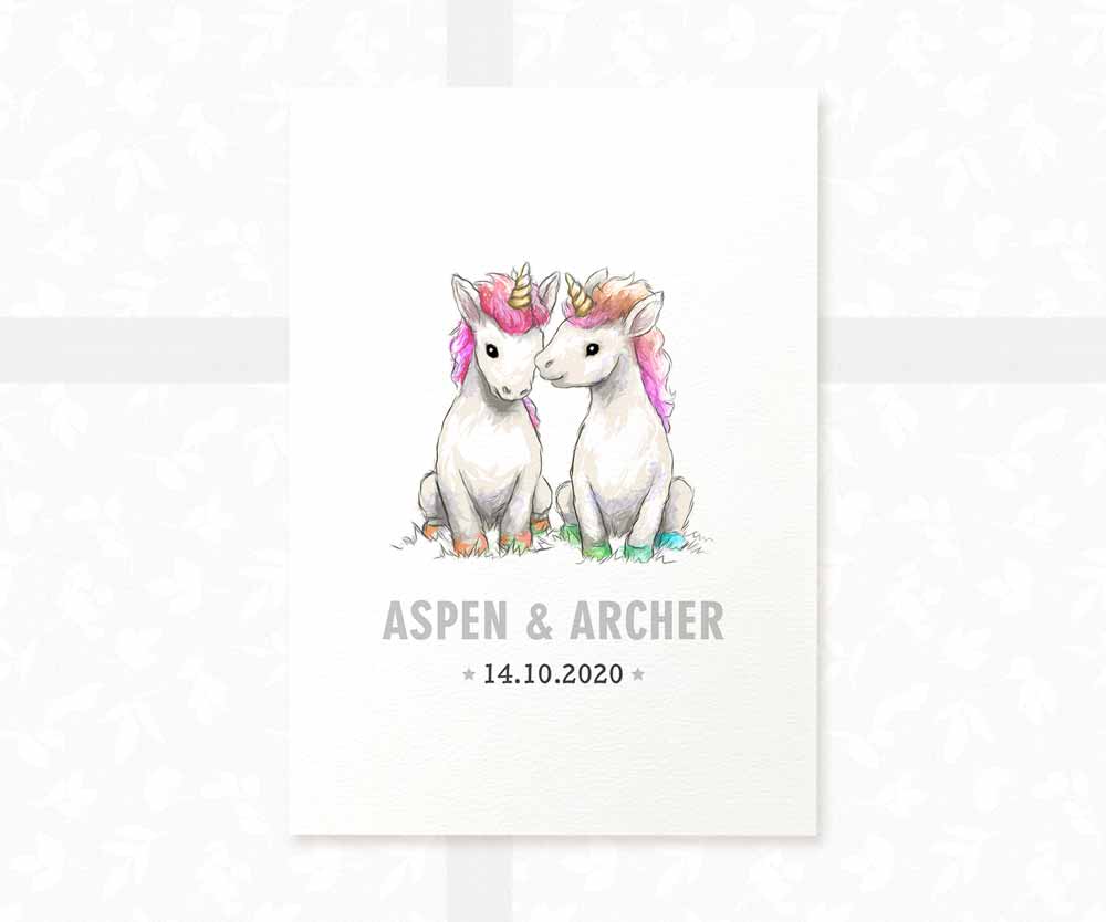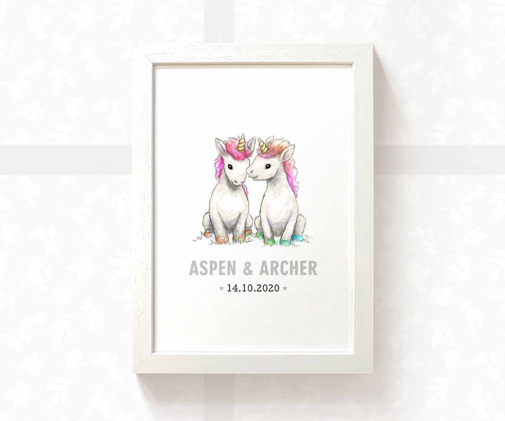 Customise your unicorn baby birth print with your babies' names and date of birth for a perfect twin nursery feature. Ideal as a twin welcome gift for new parents or a baby shower present. Whether for a memorable first birthday or a homecoming gift, this adorable print will complete your unicorn-themed nursery decor as a lasting celebration of your children.