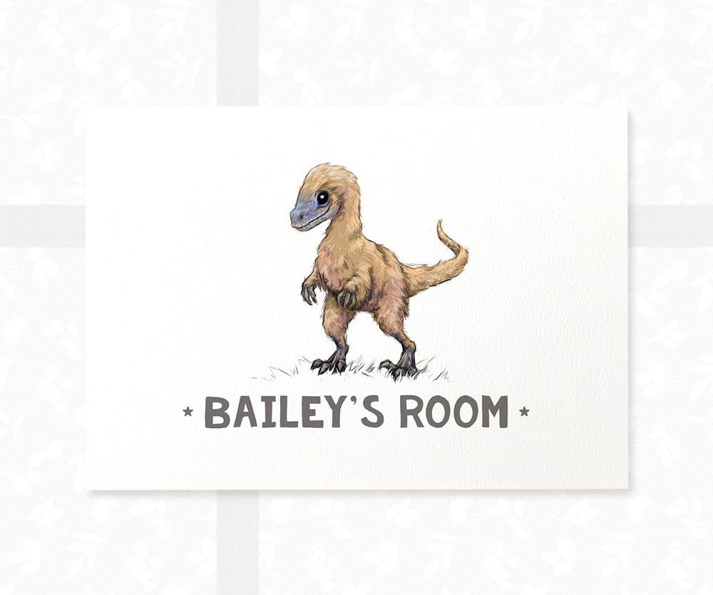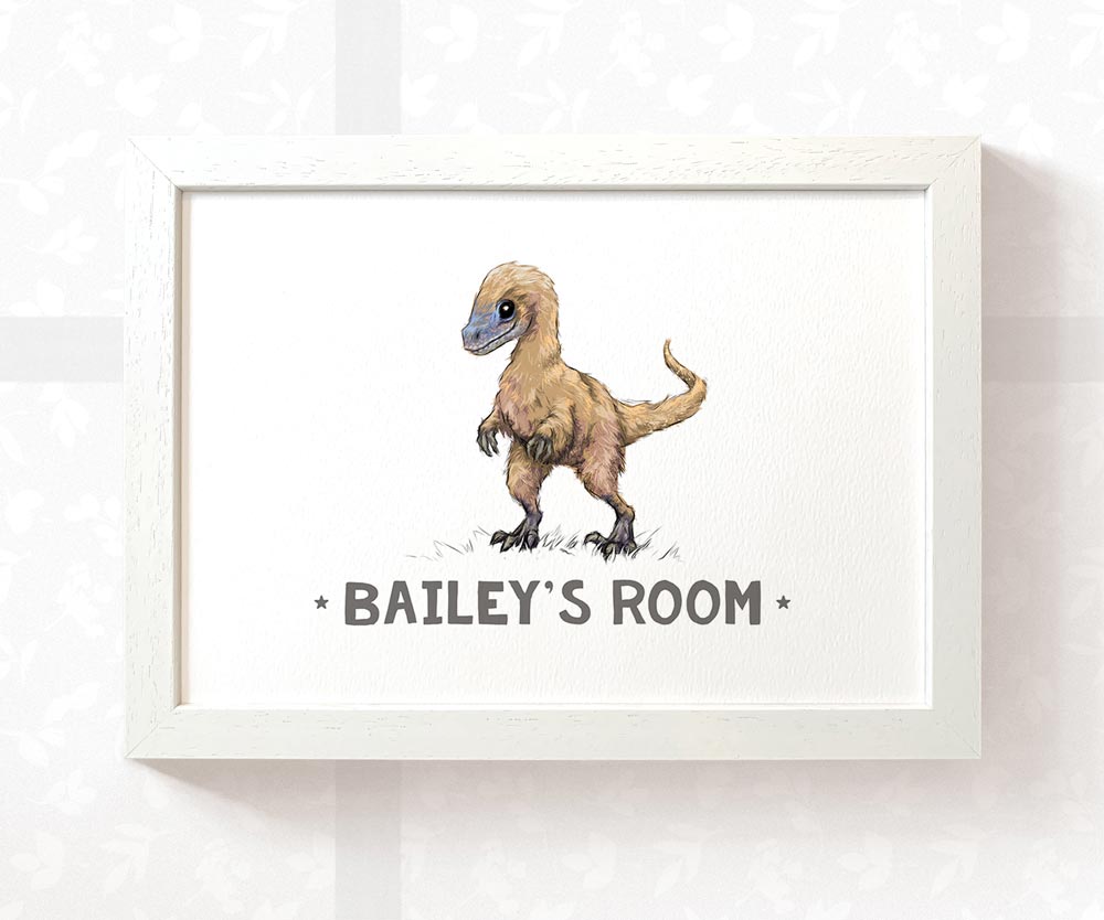 Customize your velociraptor bedroom sign to create a personalized feature with your little one's name. It's the perfect finishing touch for any dinosaur-themed children's room. Whether it's a memorable first birthday gift for your niece or nephew or an inspired homecoming gift for a newborn, this adorable nursery print will perfectly complete your baby's dinosaur-themed playroom.