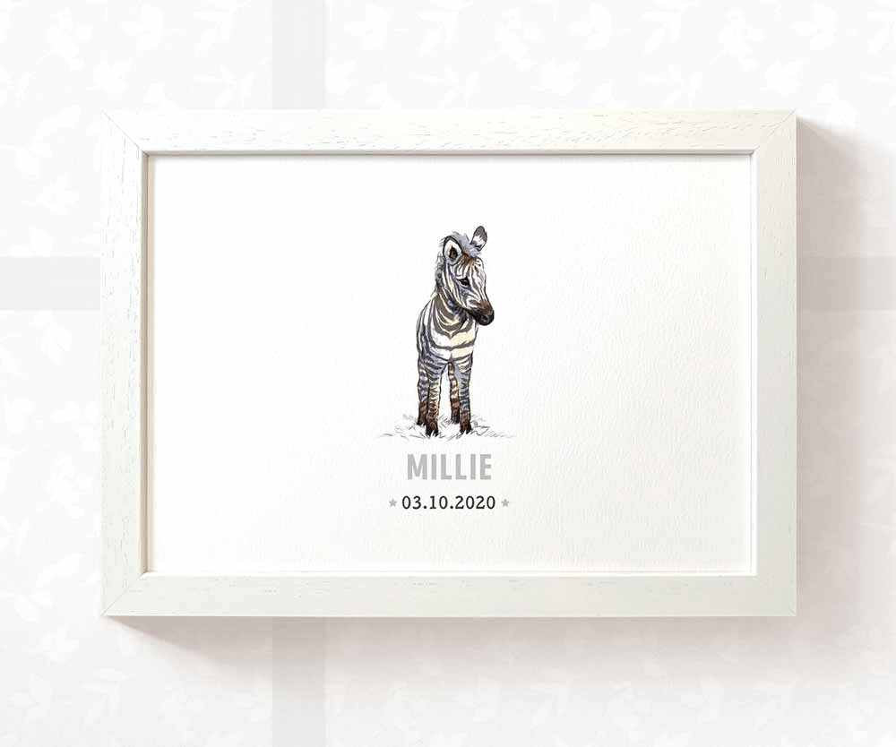 Personalise your zebra baby birth print with your baby's name and date of birth for a perfect nursery feature. Whether for a baby shower, a memorable first birthday or a homecoming gift, this adorable print will complete your safari-themed nursery decor as a lasting celebration of your little one.